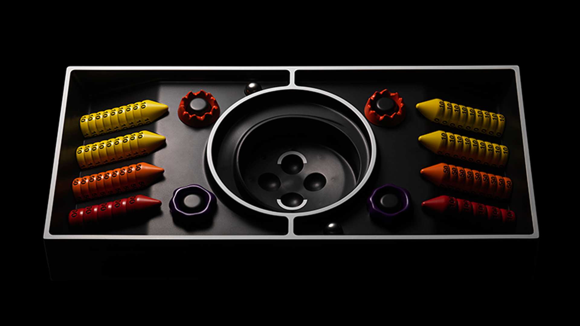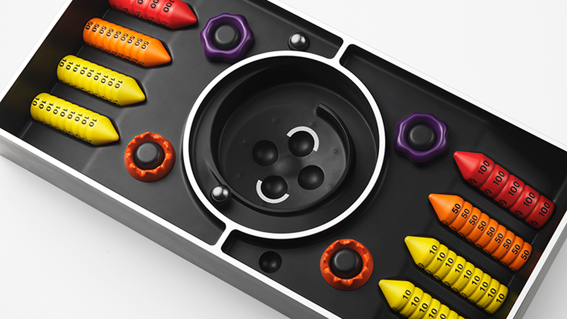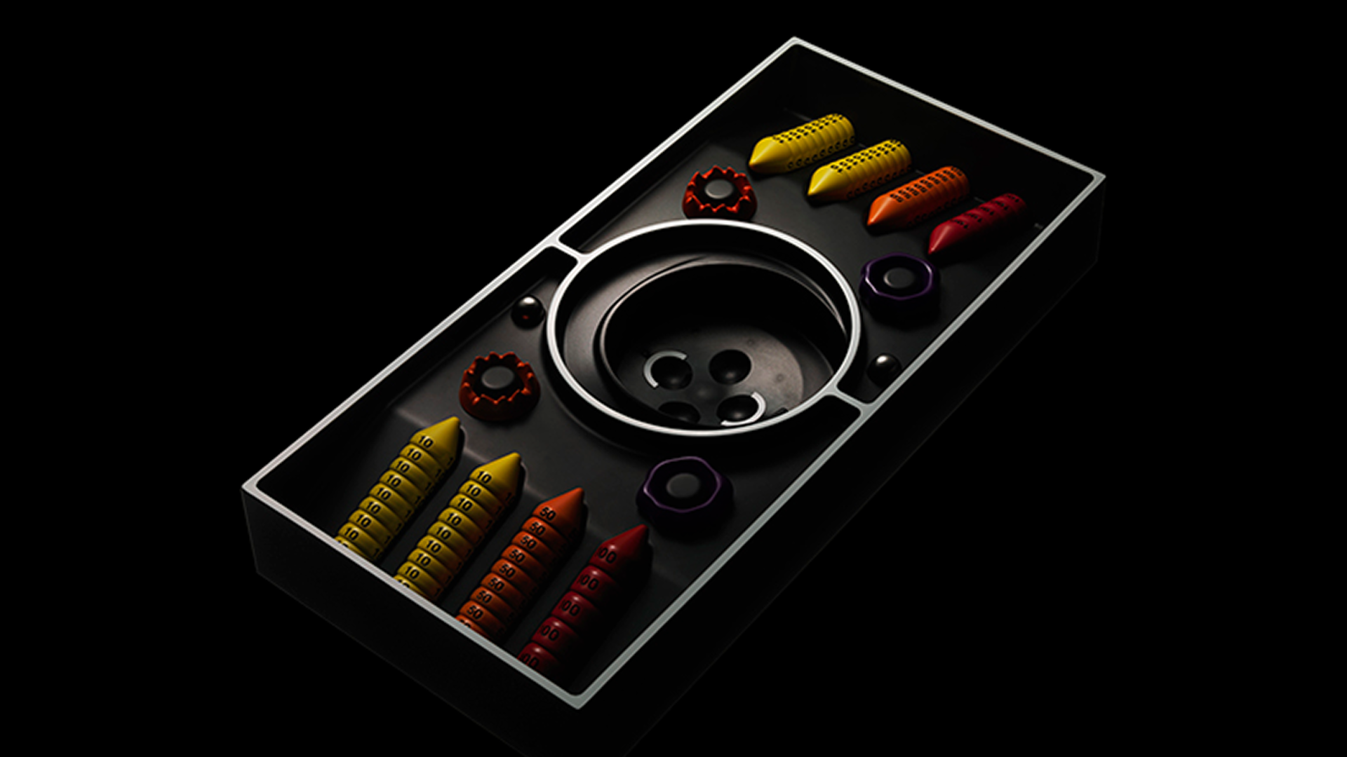 The three damage values (10, 50, and 100) are made more intuitively recognizable by making the cones taller as their numerical values increase. The use of aluminum makes it easy to stack and remove yet hard to collapse. In addition, the markers indicating Poison and Burn status are shaped like rings so that they do not conceal card surfaces.